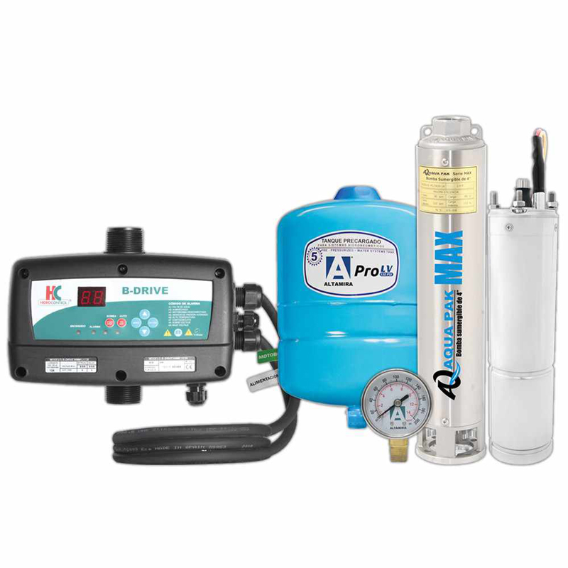 *El paquete incluye: Bomba, motor, variador de frecuencia B-DRIVE (con sensor de presión interno), tanque de acero y manómetro de acero inoxidable con glicerina. *Bomba y motor sumergible para pozos de 4″ de diametro y mayores. *Funcionamiento automático. Presión constante, velocidad variable, ahorro de energía eléctrica, arranque y paro suave. *Incluye variador de frecuencia marca HidroControl serie B-DRIVE: -Permite trabajar con voltaje de alimentación (207 a 253V). -Puesta en marcha fácil de realizar. -LEDs para establecer y visualizar: presión del sistema, corriente del motor, temperatura °C y frecuencia de operación. *Protege a la motobomba en: -Alto y Bajo voltaje. -Sobrecarga. Bajo circuito. -Trabajo en seco. Baja presión. -Alta presión. -Alta temperatura. -Nivel (flotador). *Tanque precargado de acero, 150psi presión máxima de trabajo. *Bomba AquaPak serie MAX: -Excelente calidad, robusta y de larga durabilidad. – Diseño de impulsores flotantes (antibloqueo). -Cuerpo, succión, descarga, válvula check, guardacable, colador de succión, eje y cople en acero inoxidable 304. -Impulsores en Noryl, difusores en Lexan. *Motor AquaPak: -Acoplamiento NEMA. -Carcasa, eje y cubierta de soportes superior e inferior construidos en acero inoxidable. -Bobinas y baleros lubricados en aceite de calidad PREMIUM (para aplicaciones de agua potable).